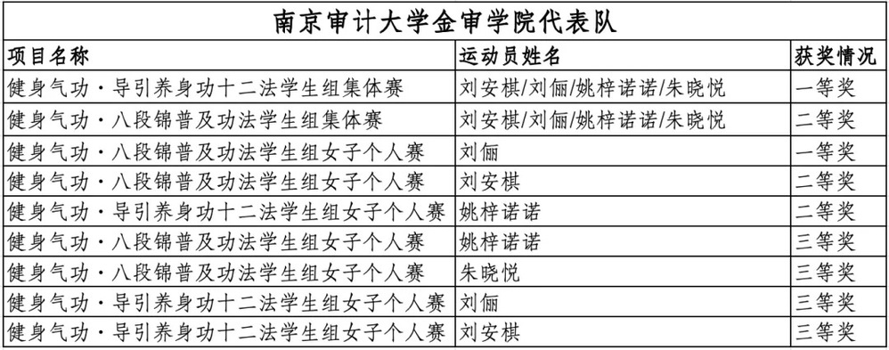 此次获奖,是南京审计大学金审学院在校园体育与传统文化融合发展中的又一硕果,提升了我校在省内高校中的影响力,未来,我校将继续深耕传统体育项目,以赛促练、以练促学,让更多的金审学子在传承中华优秀传统文化的同时,收获健康与成长!