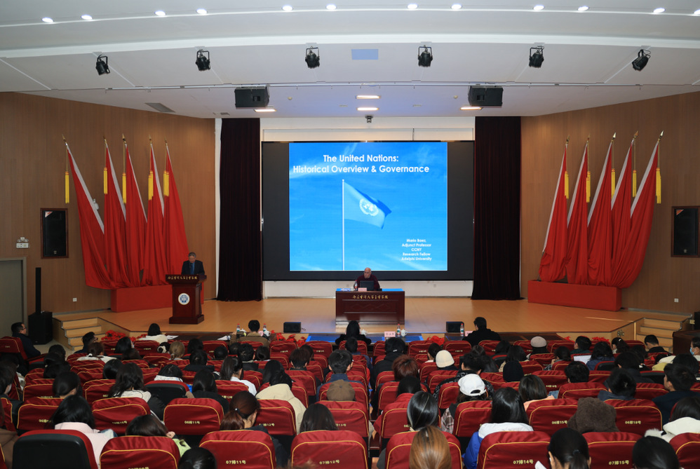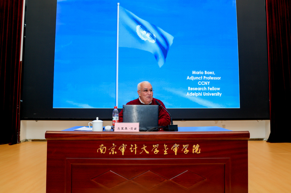 11月25日上午10时,以“联合国:历史概述与治理”为主题的专题讲座在南京审计大学金审学院图书馆报告厅顺利举行。本次活动特邀纽约市立学院兼职教授、艾德菲大学研究员马里奥·贝兹(Mario Baez)担任主讲嘉宾,马里奥·贝兹于1990年起在联合国工作,先后任联合国拉丁美洲和加勒比经济委员会主管、联合国政策和监督协调服务主管、联合国问责服务主管、联合国问责司副司长等职位,有近35年的联合国工作经验。他围绕联合国发展历程、核心职能与全球治理实践展开深度分享,为在场师生带来一场兼具理论深度与现实意义的学术盛宴。