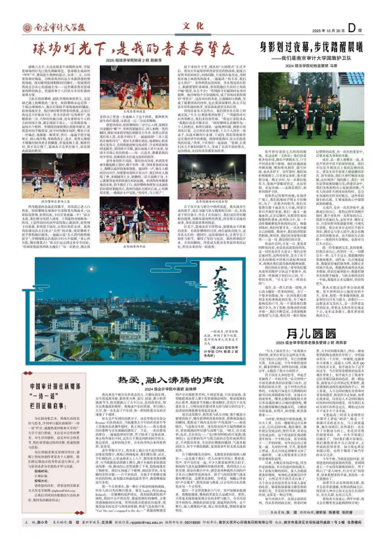 近日,康养学院2025级养老服务管理专业学生周雨菲的随笔作品《月儿圆圆》被《南京审计大学报》收录。她用细腻笔墨勾勒乡愁情愫,展现青年学子的文字素养与生活感悟。