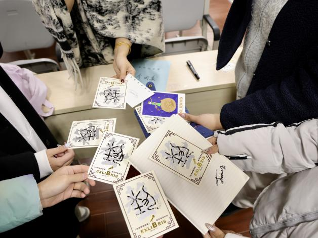 分享伊始,陈景和教授举起自制的藏书票发问,待现场热议稍歇,他翻出票面题字“艺”,顺势开启回忆。2019年读书节期间,他与青年作家杨玉莲(笔名田田)为“凤凰夜读”活动设计藏书票,原计划制作60枚呼应周年,却因师生报名火爆连夜加印至80余枚。忙于分发的他最终未留成品,仅存打样样品纪念,温情细节引发学子共鸣。