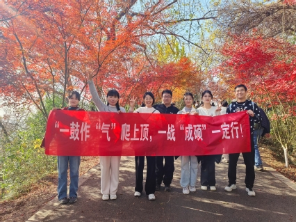 经一小时跋涉,队伍成功抵达山顶观景平台。但见长江如波澜锦绣,轮渡如梭;金陵城廓为江水环抱,掩映于斑斓山色之间。江山胜景,足以涤荡胸怀,叫人直抒书生意气。片刻,队伍中张炎老师恰觅得一枫叶烂漫处,活动高潮如期而至,师生们迅速展开红色横幅,上面醒目写着:“一鼓作气爬上顶,一战成硕一定行”。横幅鲜艳的红色与漫山的枫红相映生辉,在猎猎山风中凝聚出深情厚谊的祝福。