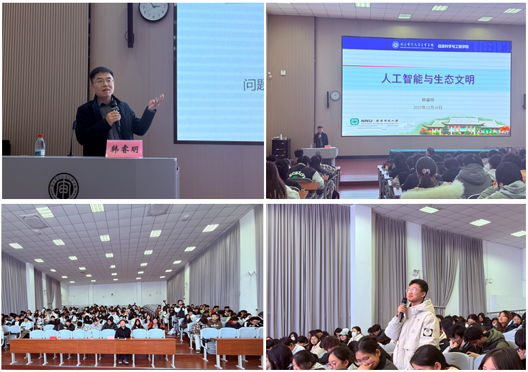 2025年12月10日,由信息科学与工程学院主办的“新技术新应用”系列讲座在南京审计大学金审学院C东101成功举办。本次讲座主题为“人工智能与生态文明”,特邀南京师范大学环境学院教授、博士生导师韩睿明担任主讲,旨在探讨如何借助人工智能技术推进生态文明建设,为可持续发展提供新思路与解决方案。