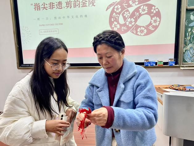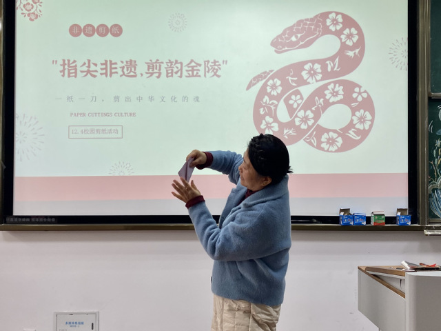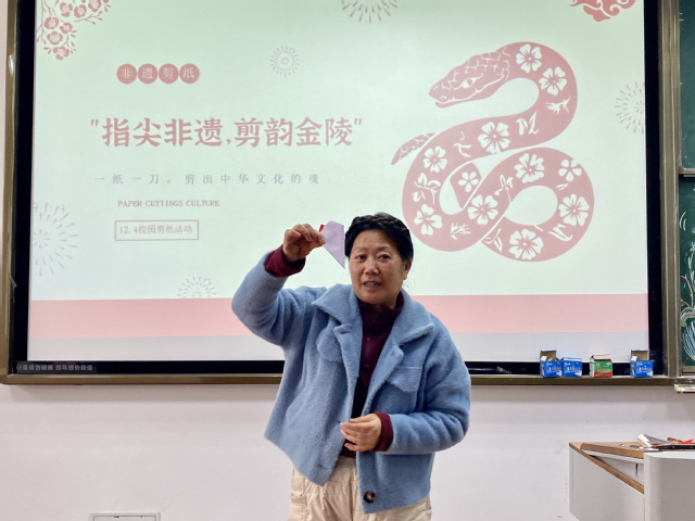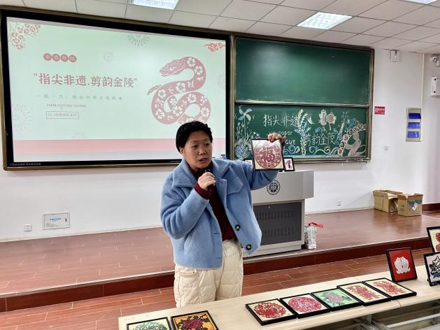 红纸铺展,剪刀翻飞,一纸一世界的东方美学在校园中悄然绽放。12月4日下午,“指尖非遗,剪韵金陵”非遗体验活动在C南201教室顺利举办。本次活动以金陵剪纸这一国家级非物质文化遗产为核心,通过经验分享、技艺实操与作品交流,让师生们在沉浸式体验中,触摸传统剪纸的温度,感受金陵文化的深厚底蕴。