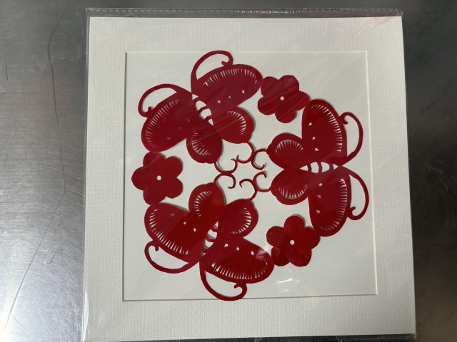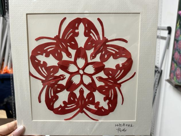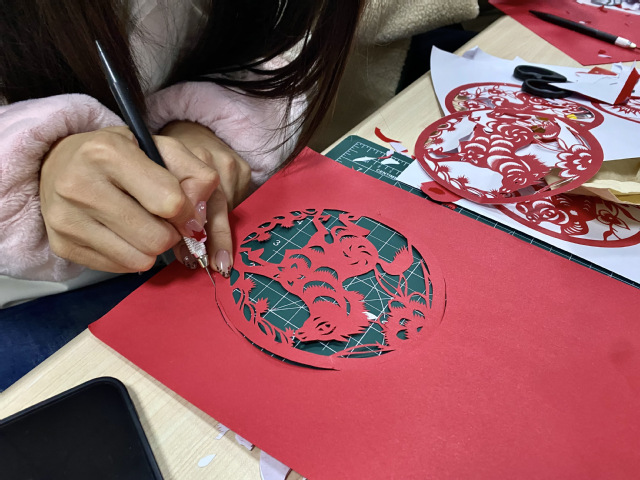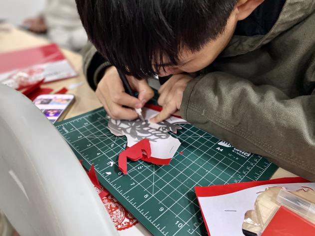 在实践环节,在应加玲老师的指导下,同学们围坐在桌前,手持红纸与剪刀,从简单的吉祥纹样入手,再到一幅蜻蜓荷花特色图案。从描摹轮廓到精密切剪,从调整角度到修整细节,教室里不时响起剪刀开合的清脆声响,通过剪刀与指尖的默契配合,原本普通的红纸在指尖逐渐蜕变为准绳工整的作品。
