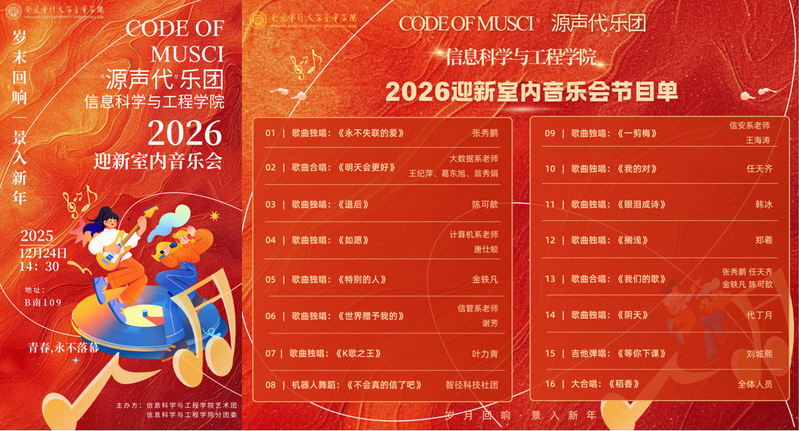 整场音乐会旋律跨越专业界限,音符联结师生情感,既是对2025年的温暖总结,也是对2026年的美好展望。活动在热烈的掌声中圆满落幕,充分展现了信息科学与工程学院师生团结向上、全面发展的精神风貌。