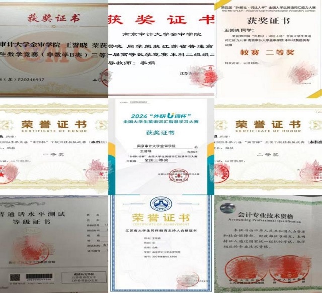 在学业与竞赛的疆场上,王誉晓始终保持冲锋姿态,以赛促学、以学赋能,在一次次攻坚中收获成长与荣光。数学领域,她深耕题海、拆解难点,于千锤百炼中突破瓶颈,先后斩获江苏省高数竞赛二等奖、全国高数竞赛三等奖,用坚持诠释“勤能补拙”;专业领域,她深耕税收专业知识,将理论与实践深度融合,在第五届全国“衡信杯”中勇夺一等奖,又在第六届赛事中稳获二等奖,用实力夯实专业根基;英语领域,她兼顾积累与创新,既在“词达人”杯校赛中斩获二等奖、在外研“U词杯”全国赛事中拿下三等奖,更带领团队勇闯“外研社・国才杯”英语组短视频大赛——从脚本的反复打磨、拍摄的精益求精,到剪辑的细致雕琢,她全程统筹、全情投入,最终将校赛三等奖收入囊中。此外,她主动拓宽能力边界,成功考取初级会计证书、普通话二甲证书、红十字救护员证等多项资质,以多元储备应对成长挑战。每一份证书的背后,都是挑灯夜读的坚守;每一项奖项的荣光,都是敢闯敢拼的勋章,生动诠释着她不服输、不止步的青春品格。
