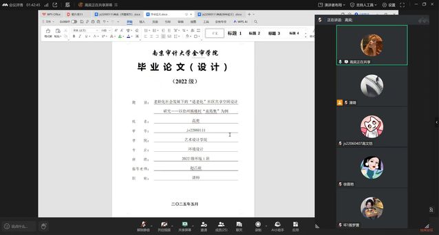 为确保线上预答辩的秩序与质量,环境设计专业教研室进行了周密部署。预答辩严格按照正式答辩流程,分为学生陈述、作品展示、评委提问与点评、学生回应等多个环节。142名同学依次通过屏幕共享,清晰展示了各自毕业论文(设计)的阶段性成果。选题范围广泛,涵盖了适老化空间、城市微更新改造与活化、公共艺术空间营造、乡村文旅环境提升、智能化居住空间设计等多个前沿与实践领域,充分体现了环境设计专业回应社会需求、关注人居质量的学科特点。