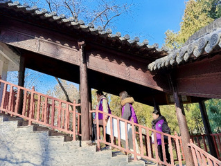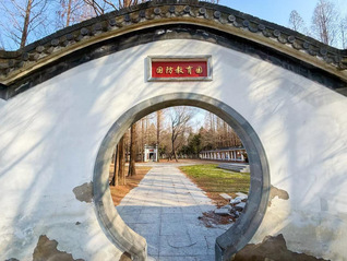 研学过程中,团队聚焦泗洪烈士陵园国防教育园圆拱门实景,重点记录拱门的形制设计、题字风格,以及其与后方林荫步道形成的空间层次和视觉呼应,深入剖析红色纪念场所中景观元素的叙事功能与美学表达。沿着陵园内的木质长廊拾级而上,学子们边观察、边交流、边探讨,认真总结红色纪念建筑在实用性与精神性表达上的设计巧思。