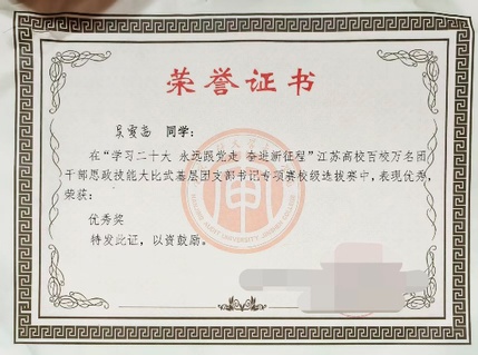 志愿服务中,她是扎根一线的“暖心使者”。2023年11月,南京马拉松赛场之上,她以饱满热情完成赛事引导、物资保障等志愿服务,凭借认真负责的态度斩获2023年南京马拉松志愿者证书;同年11月至2024年4月,她持续投身管理学院实践部博爱中心志愿活动,定期参与公益帮扶等常态化服务,用坚持践行奉献初心;2024年5月,栖霞区“博爱市集”公益现场,她协助市集筹备、引导市民参与、普及公益知识,用活力为公益事业注入青春力量;2024年9月至2025年1月,她化身明孝陵博物馆钟山文学馆长期志愿者,深耕文物讲解、游客引导、文化传播等工作,在服务中传播传统文化,积累了丰富的实践经验。凭借志愿服务的突出表现,她获评校级“优秀志愿者”称号。