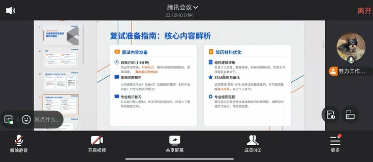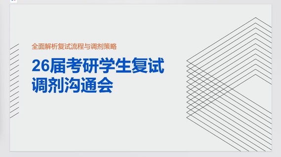 李老师结合复试与调剂优秀案例,从复试备考、面试技巧、调剂策略三个方面展开分享。他详细讲解了专业课复习重点、英语口语准备方法,拆解了面试问答逻辑与临场应变技巧,重点分享了调剂信息搜集、志愿填报“冲稳保”原则及联系导师的实用方法,用真实案例为学子们避坑指路。
