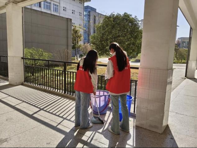 段少红同学则与同伴携手,承担起连廊区域的保洁任务,认真清扫地面灰尘、整理散落杂物,用双手守护公共空间的整洁舒适,在平凡的志愿劳动中传递邻里温情。