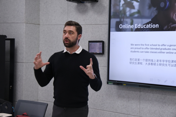 座谈会后,Steven Stumph博士为我校师生举办讲座,介绍了南加州大学老龄学院相关项目情况及全球养老服务发展动态,并与在场师生进行了交流。