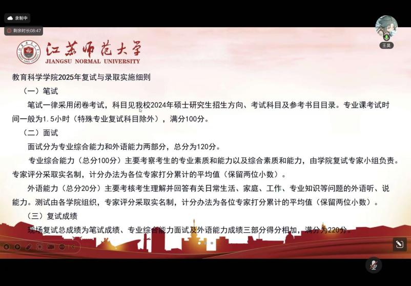 2021级学前4班的王昊同学,去年曾同样以高分斩获江苏师范大学学前教育专业录取资格。他围绕复试参考书籍、复试流程、成绩计算规则及笔试真题解析展开分享,同时着重提醒同学们,考研竞争日趋激烈,唯有脚踏实地、认真备考,方能行稳致远。