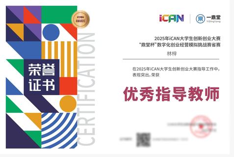 在2025年iCAN大学生创新创业大赛“鼎堂杯”数字化创业经营模拟挑战赛全国总决赛中,林梓老师指导的学生团队表现亮眼,其中“畅通无阻”队斩获一等奖(最高奖项),“CAN”队荣获三等奖,她也凭借出色的指导表现,获评该赛事全国总决赛优秀指导教师。此外,她还指导学生参加“学创杯”全国大学生创业综合模拟大赛等赛事,均取得了优异成绩,用实际行动为学生搭建起实践与创新的平台。