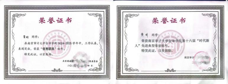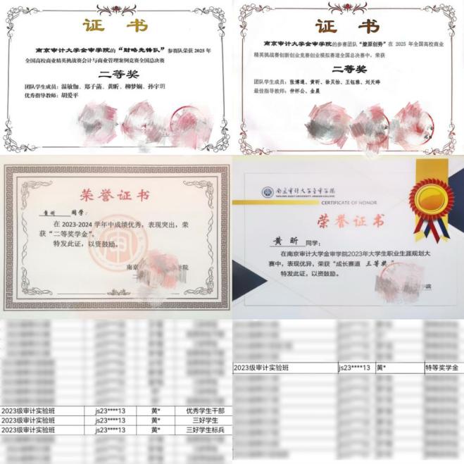 她始终秉持勤勉踏实的治学态度,认真钻研审计专业知识,专业课成绩稳步提升,连续两年获评校级二等奖学金、特等奖学金,努力夯实专业基础。在厚植理论功底的同时,她主动拓展能力边界,认真备考并顺利通过全国初级会计资格考试、全国计算机等级考试(二级)、大学英语四六级考试及普通话水平测试,不断提升综合素质。主持大学生实践创新训练项目一项,并在全国商业精英挑战赛等学科竞赛中也有所收获,努力将理论知识应用于实践,在学术与实践中成长。