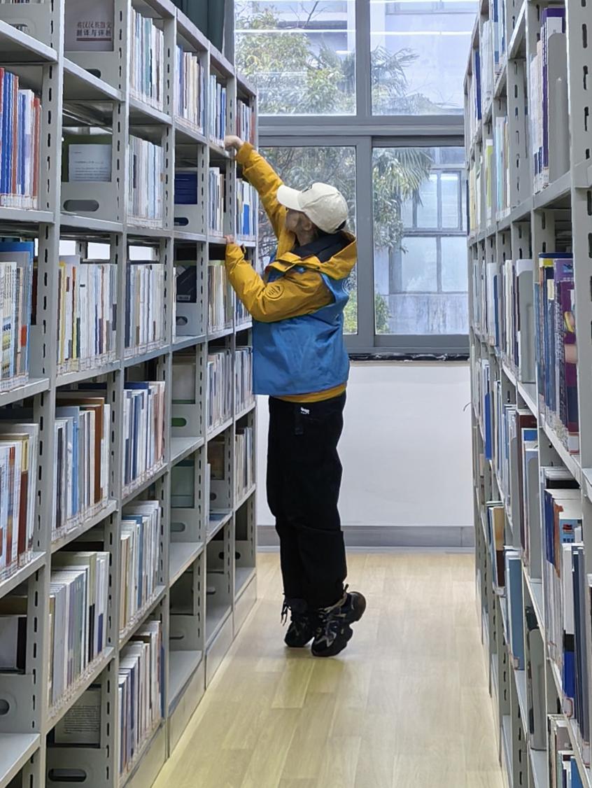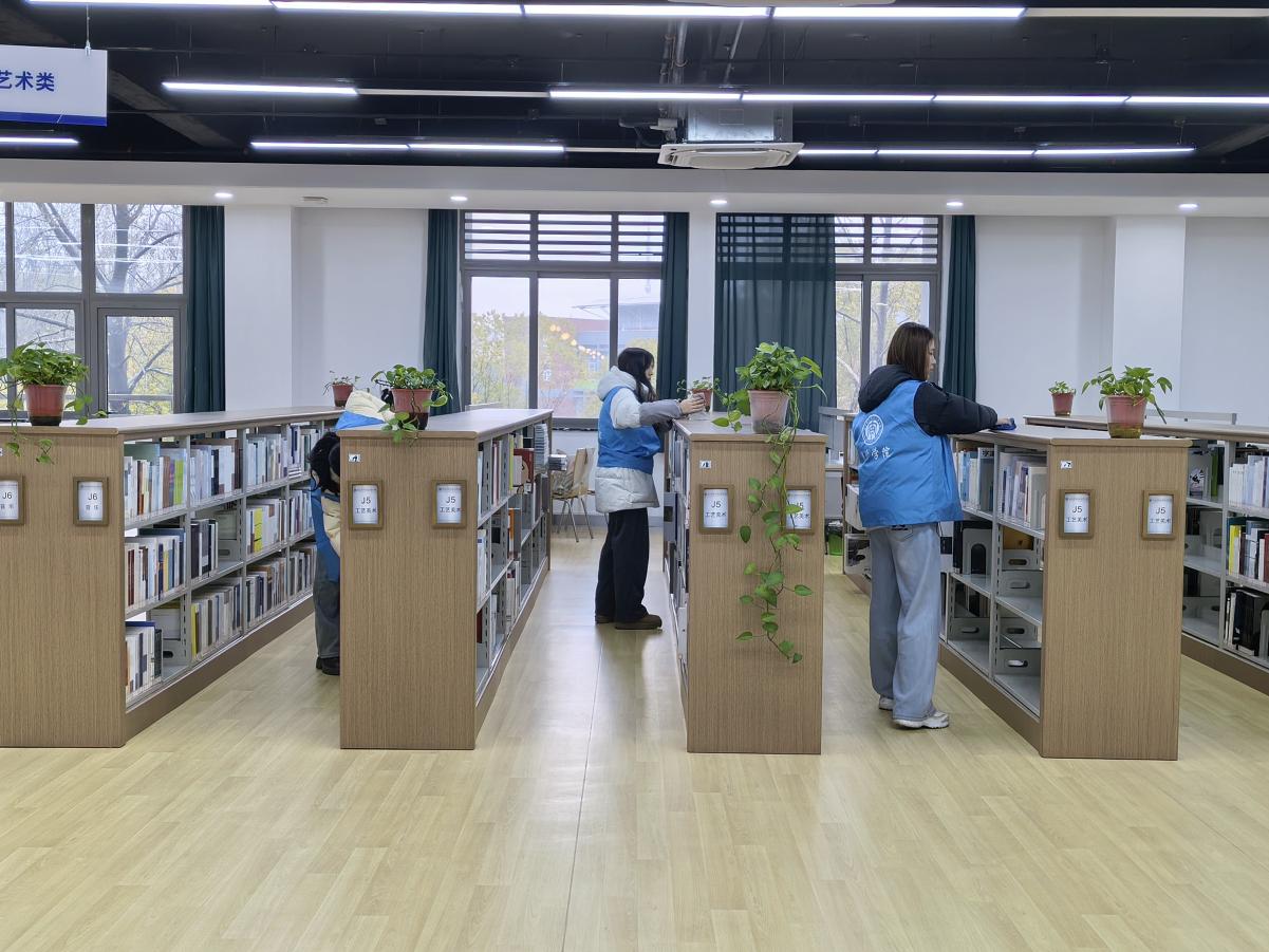 服务现场,身着统一蓝色志愿马甲的志愿者们,在图书馆工作人员的指导下迅速分工、高效协作。擦拭组的同学手持清洁工具,细致擦拭书架边框、隔板与边角缝隙,将积尘逐一清理,让书架洁净如新;整理组的同学耐心核对图书分类编号,将错位、歪斜的书籍逐一归位,严格按照馆藏标准规范排序,确保书籍摆放整齐有序,方便师生查阅;绿植组的同学轻搬轻放各类盆栽,将绿萝等绿植精心布置于书架顶端与窗边角落,为静谧的书香空间增添了一抹盎然生机与清新绿意。