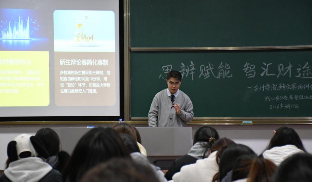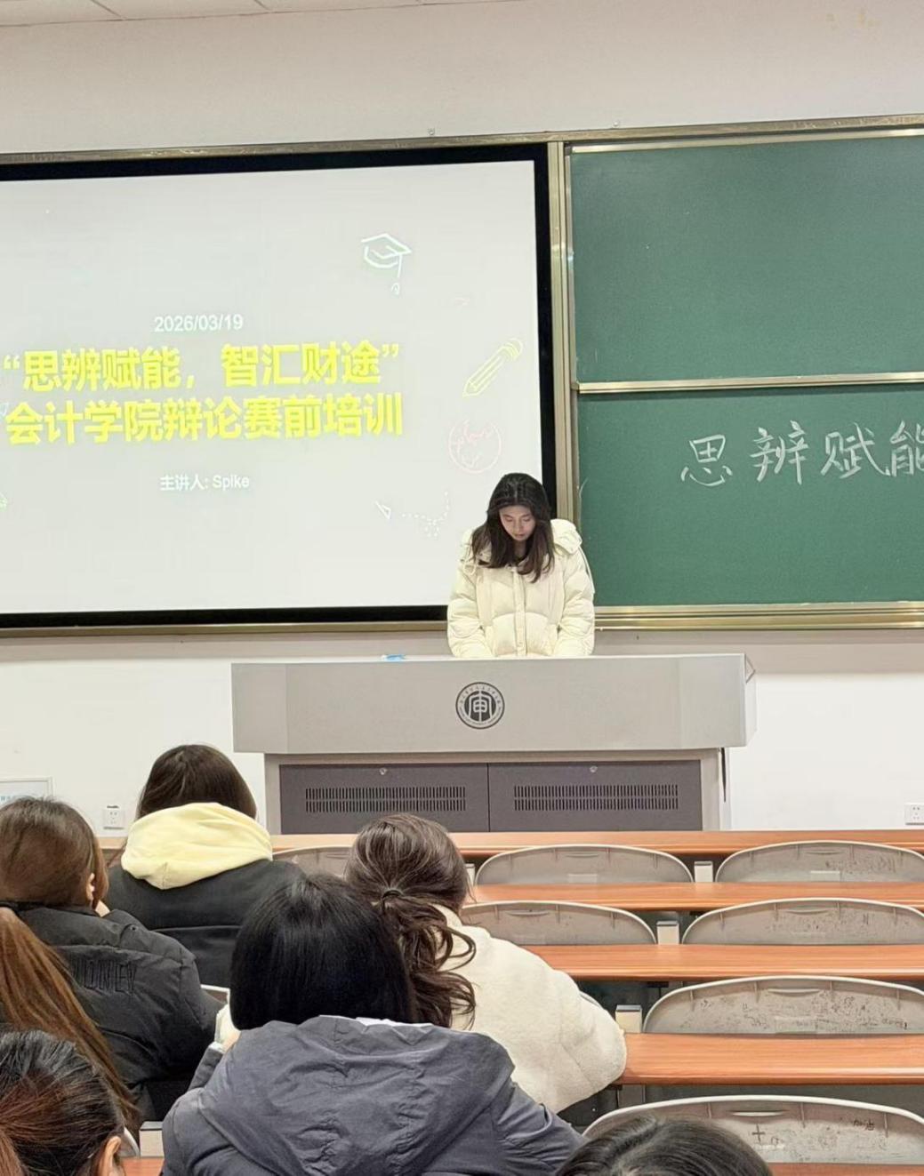 2026年3月19日18:30,南京审计大学金审学院会计学院智财挑战社联合初心会计社,于C南101教室举办财务数智化辩论赛赛前专项培训。智财挑战社指导老师徐一帆担任主讲人,智财挑战社社长王品洁主持培训,两社团全体参赛选手及赛事相关工作人员全程参与,此次培训旨在提升选手专业素养与辩论实战能力,为赛事顺利推进筑牢基础。
