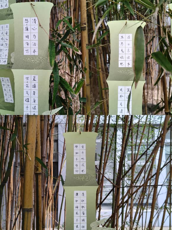 精心制作的竹形廉洁书签被悬挂于校园竹林之间,打造出自然意趣与廉洁文化交相辉映的特色廉洁景观。同学们以竹喻君子,在竹形卡纸上书写廉洁警句与经典诗词,将竹“宁折不弯、中空有节”的君子品格,与“清正廉洁、修身律己”的价值追求有机融合,让师生在漫步休憩中沉浸式感受廉洁文化熏陶,切实营造出“步步见廉景、时时沐廉风”的浓厚育人氛围。