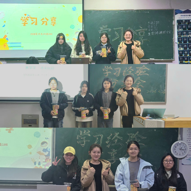 为进一步帮助同学们明晰学习方向、夯实专业基础,搭建跨班级学习交流与互助共进的优质平台,2026年3月26日晚,艺术设计学院艺术科技1班、艺术科技2班与环境设计1班,联合举办主题学习经验分享会。本次分享会特邀三个班级绩点排名前三的优秀学子作为分享嘉宾,现场传授学习心得与实用备考、学习技巧,辅导员耿老师亲临活动现场,为优秀学子颁发荣誉奖品,并发表寄语勉励全体同学。