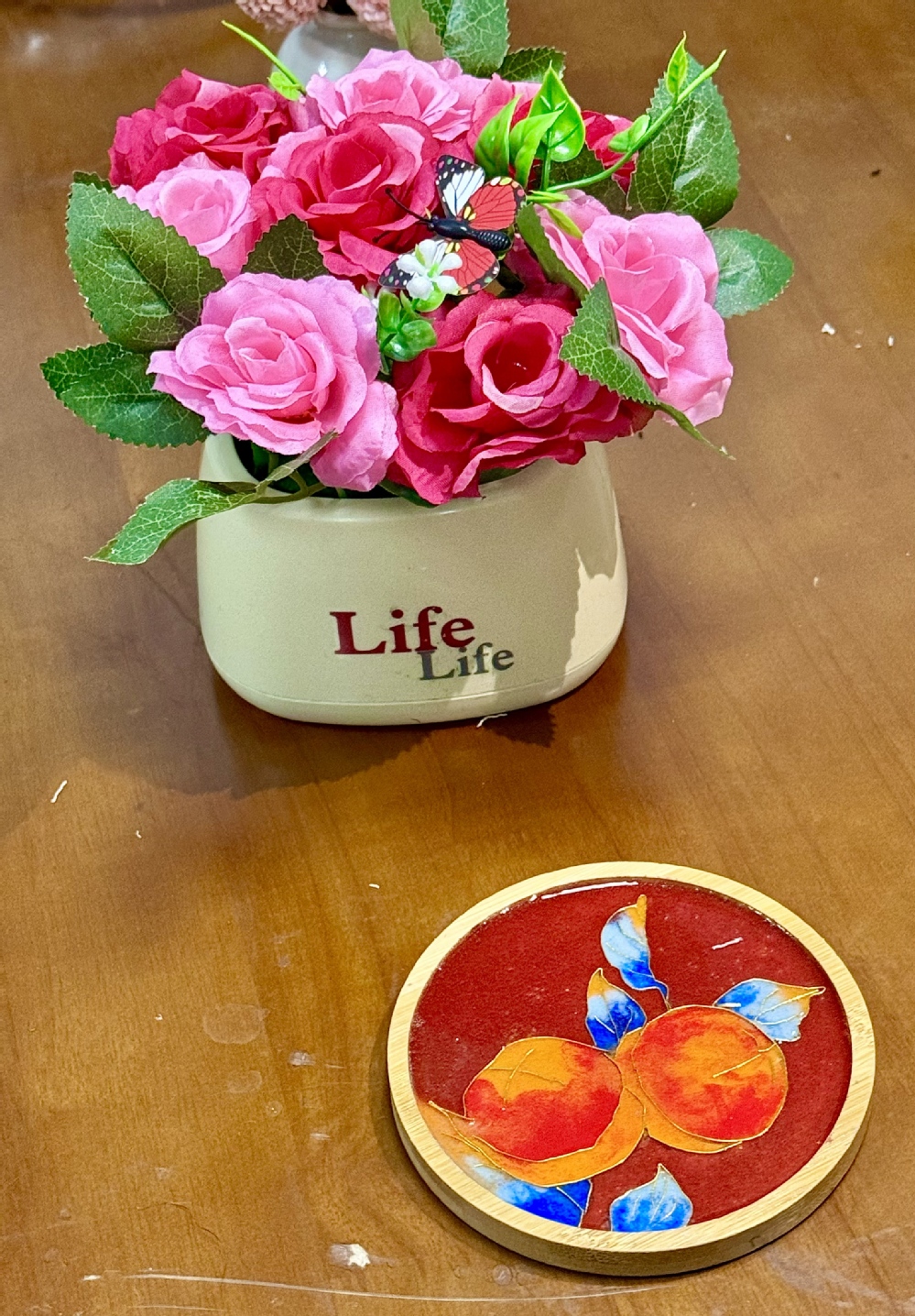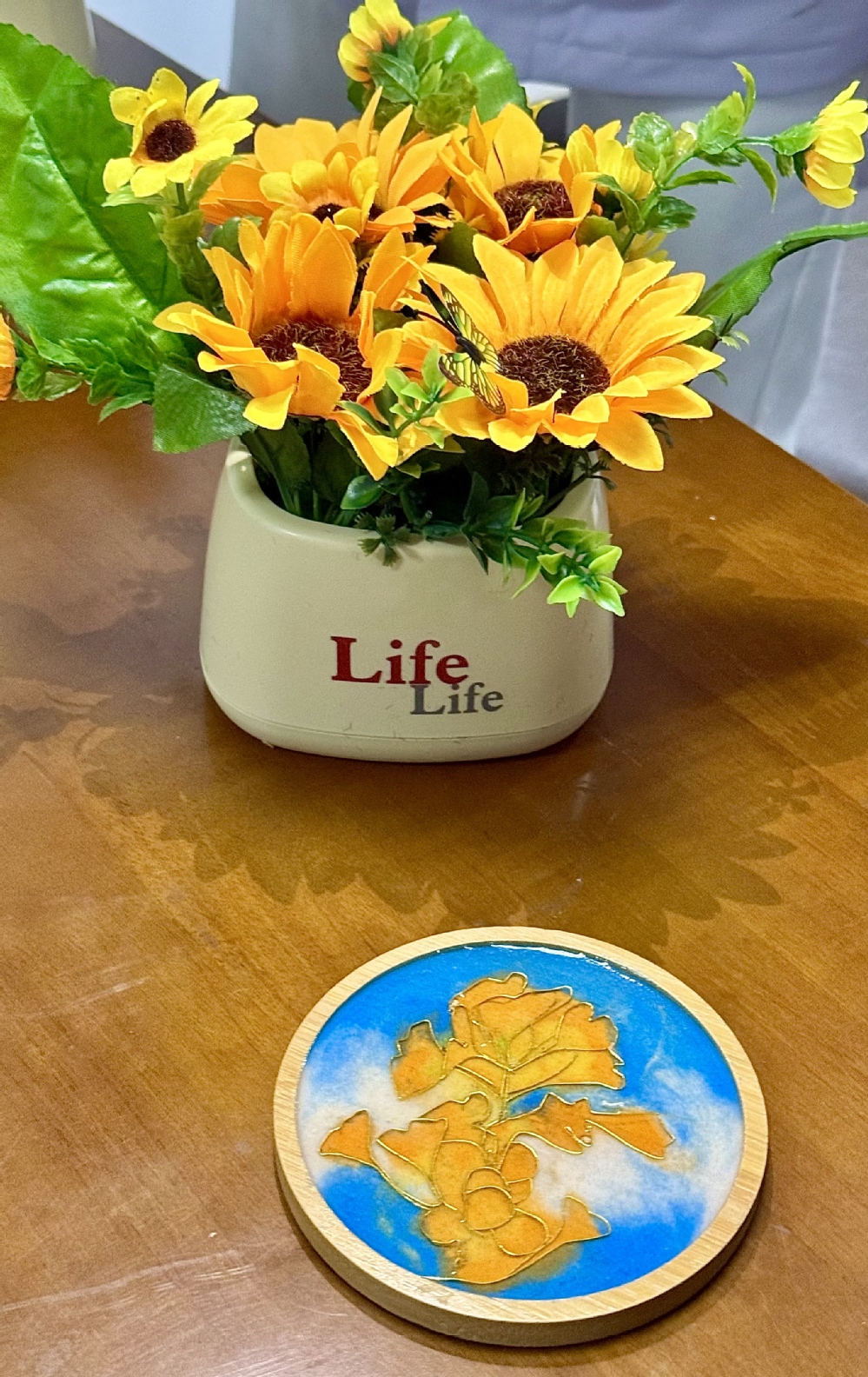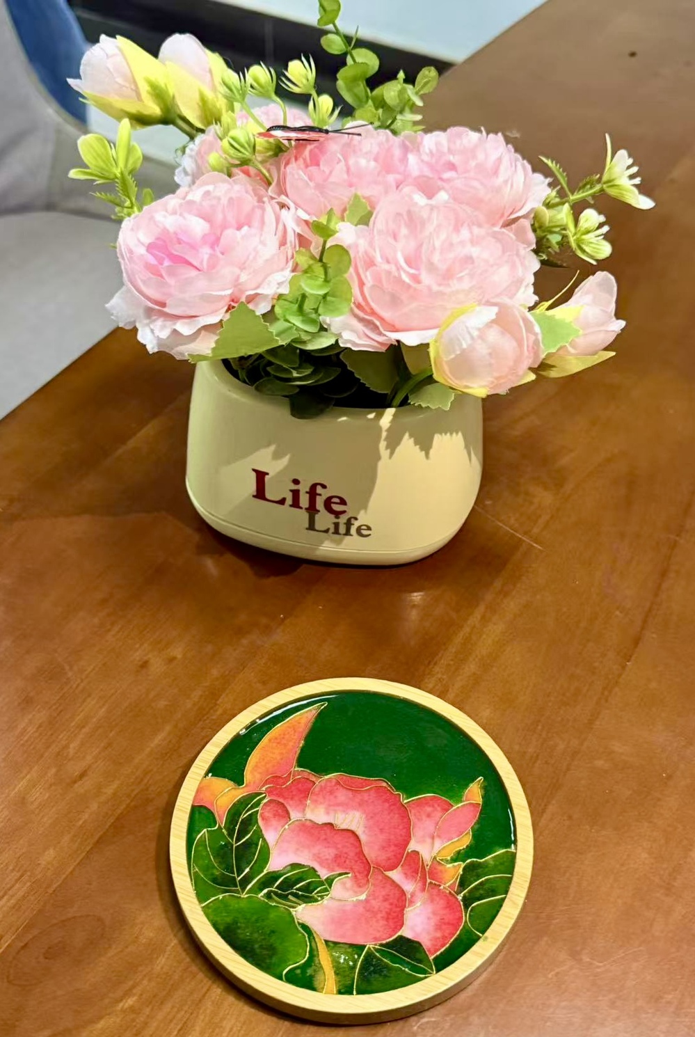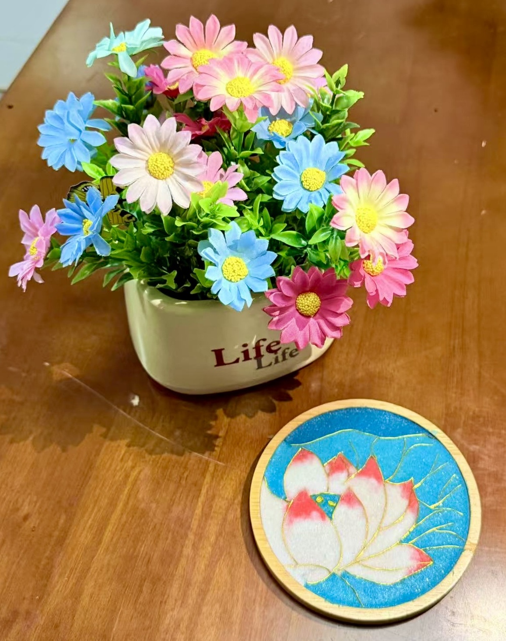 现场布置清新温柔、氛围感拉满:娇艳的郁金香错落点缀,暖黄灯光轻洒全场,搭配舒缓悠扬的背景音乐,让人一踏入便卸下平日的紧绷与疲惫。结合学生需求,学院精心筹备了DIY掐丝珐琅杯垫与戳戳毛线杯垫两大特色手作项目,兼顾文化传承与解压疗愈双重属性,满足不同同学的创作偏好。