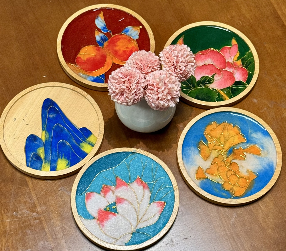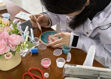 在掐丝珐琅杯垫体验区,非遗文化的魅力与春日的温柔相得益彰。同学们手持镊子,将细如发丝的铜丝精心弯折,勾勒出烂漫花朵、灵动星芒与可爱的卡通纹样,再以彩釉细细填色。慢工细作之间,思绪渐渐放空,浮躁被指尖的专注一点点抚平。不少同学感慨:“在掐丝填砂的过程中,感觉所有的焦虑都被抚平了,只剩下专注和宁静。