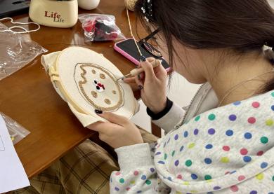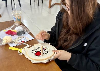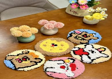 戳戳毛线杯垫区则满是软萌治愈的气息,成为大家释放压力、放松身心的 “快乐天地”。同学们手持戳针,在印有图案的布料上轻轻戳刺,将缤纷毛线层层固定,一戳一按之间,软绒绒的肌理慢慢成型,憨态可掬的小熊、清新可爱的郁金香、温馨浪漫的爱心等纹样跃然眼前。这种简单重复的动作自带解压效果,仿佛所有烦恼都随着指尖的动作一并消散。现场欢声笑语不断,大家互相交流创意、切磋技巧,在轻松愉悦的氛围中拉近了彼此距离,也收获了亲手创作的满满成就感。活动结束后,同学们纷纷分享心声:“平时学业压力大,总容易陷入内耗,这次终于能静下心来专注做一件事。”“戳毛线的过程太治愈了,还意外认识了很多志同道合的新朋友。”