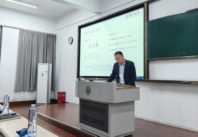 讲座伊始,王文熠经理结合当代大学生的日常生活切入,指出“投资离我们并不遥远”。他通过询问“买过基金吗”“用过余额宝吗”等贴近生活的问题,引导同学们认识到投资已渗透于日常点滴。随后,他从“为什么要参与投资”展开深入讲解,强调金融知识必须通过市场验证,鼓励同学们将课堂所学的宏微观经济学、金融市场学等理论知识与市场实践相结合,真正理解“风险”的本质。