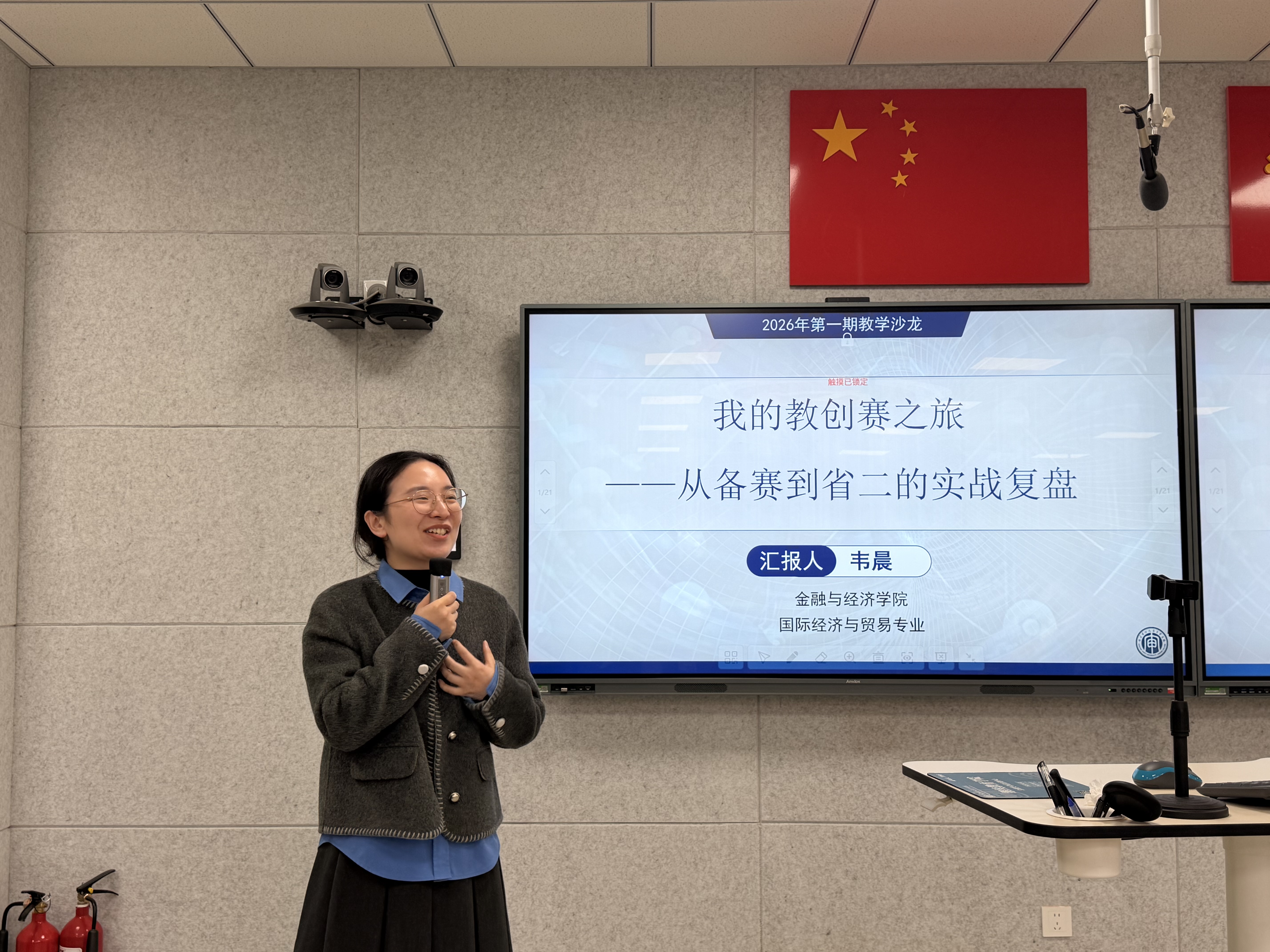 2026年4月15日下午,由教师发展中心主办的首期教学沙龙在智慧教室B北211顺利举行。本次活动邀请金融与经济学院韦晨老师担任主讲嘉宾,以“我的教创赛之旅——从备赛到省二的实战复盘”为题,分享其参加江苏省教师教学创新大赛(以下简称“教创赛”)的备赛历程与实战心得。活动由教务处副处长李娟主持,王薇副校长出席并作总结讲话,各学院、部教师代表参与交流。