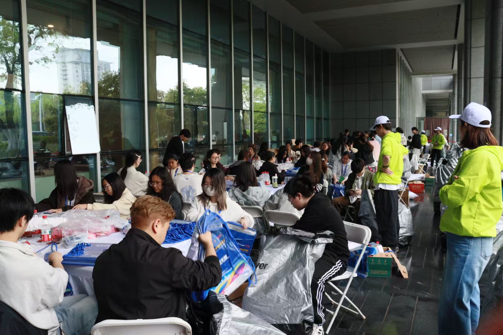 赛事筹备阶段,志愿者们便早早投入紧张的赛前准备。4月9日清晨,首批志愿者准时进驻物资分装仓库,面对堆叠如山的补给品、赛事包,同学们迅速分工协作,分拣、清点、装箱、搬运,每一个环节都一丝不苟。三天时间里,大家每天连续工作近十个小时,弯腰分装数千次,手指被纸箱划伤、掌心磨出水泡已成常态。为保障上万份赛事包物品数量准确、摆放规范,同学们主动承担质检复核任务,反复核对清单,对每一箱物资进行二次检查,确保“零差错、零遗漏”。长桌旁,志愿者们专注的身影被玻璃幕墙映出,有人双腿浮肿短暂休息后立刻返岗,有人嗓子沙哑仍协调物资调配,用执着与坚守筑牢赛事起跑根基。