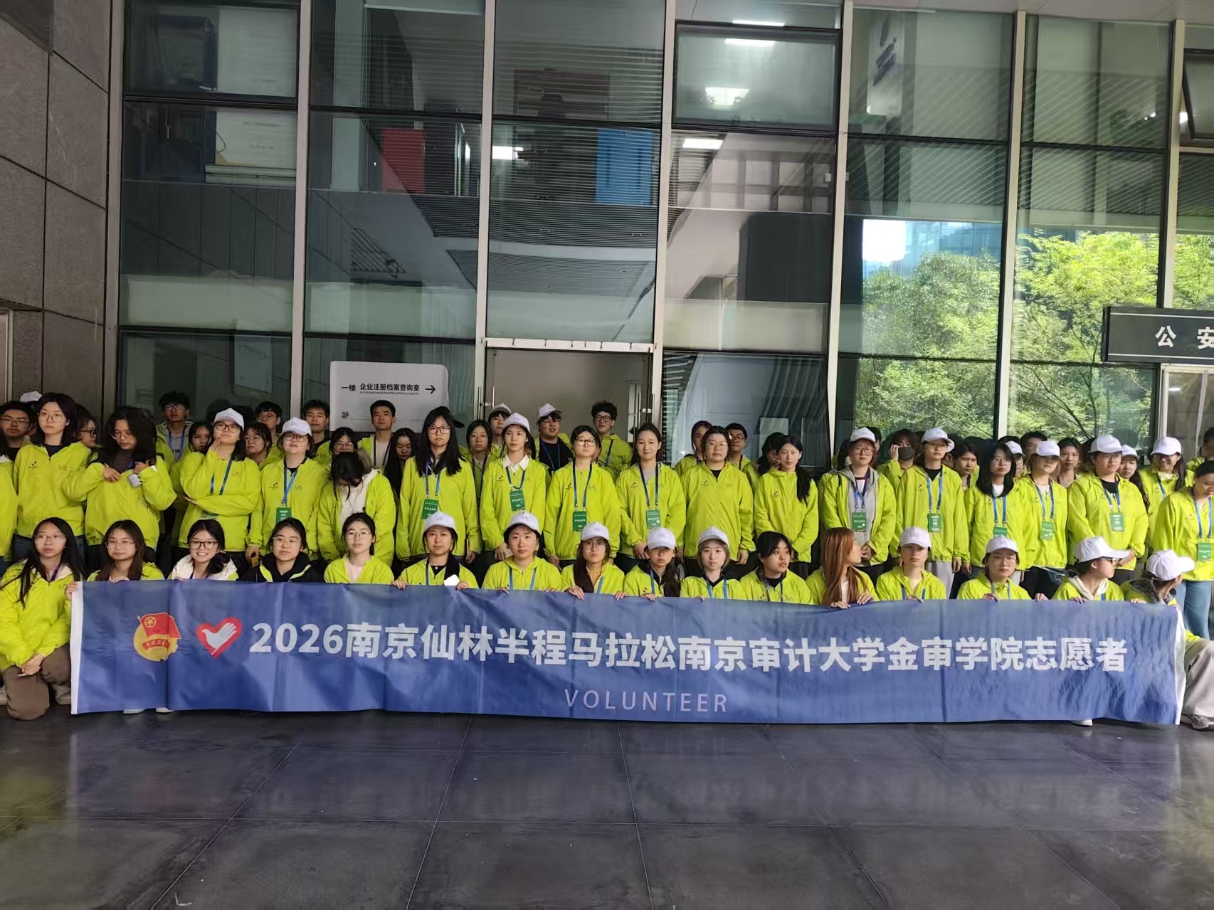 比赛当日,绵绵春雨为保障工作增添挑战。志愿者们清晨冒雨出发,提前抵达赛道沿线补给站、起终点等岗位。雨中,他们争分夺秒布置补给站点,用身体护住物料不被雨水浸湿;为选手递上温热的饮用水与能量食品时,指尖因冷水泛白发皱却毫不在意;赛道旁,他们举着指引牌为跑者指路,用热情的呐喊驱散风雨寒意。从清晨八点半到午后赛事结束,大家连续坚守近八小时,在风雨中圆满完成物资补给、秩序维护、医疗协助等任务,那一抹亮眼的“荧光绿”,成为仙林赛道上最温暖的风景。