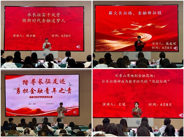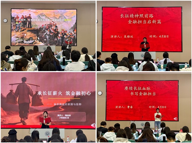 此外,2024级国贸1班梅依林同学《承长征薪火,筑金融初心》、2025级金融2班胡方雅同学《承长征实干风骨,做新时代金融追梦人》、2025级税收1班蔺威硕同学《薪火长征路,金融新征程》、2025级税收2班马子雯同学《赓续长征血脉,书写金融担当》、2024级国贸3班吴雅玟同学《长征精神照前路金融担当启新篇》、2025级金融实验班曹睿同学《赓续长征血脉,书写金融担当》,或追忆革命先辈奋斗史,或结合自身感悟,或展望金融行业发展方向,用真挚的情感、铿锵的语言,展现出新时代金融学子传承红色基因、践行金融使命的坚定决心。选手们的演讲或深情款款,或激昂澎湃,赢得现场观众阵阵掌声。