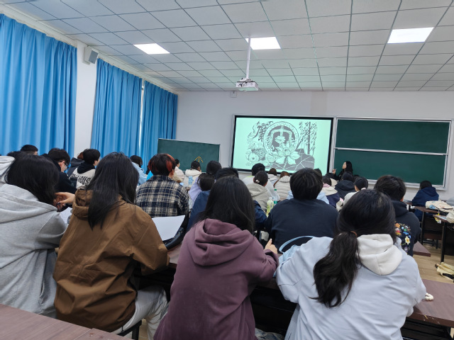 授课过程中,吕游老师展示了多幅学生提交的校级廉洁主题手绘装饰画作品,这些作品以“廉洁”为核心主旨,融入了莲花、竹、松柏等象征廉洁自律的元素,兼具艺术美感与思想内涵。教师结合每幅作品的设计思路,逐一分析形式美法则的运用。在案例分析环节,教师注重引导学生主动思考、互动交流,邀请参与作品创作的学生分享自己的设计初衷、形式美法则的运用思路以及对“廉洁”主题的理解。学生们积极发言,结合自身创作经历,畅谈如何将抽象的廉洁理念通过具体的设计形式呈现,如何运用形式美法则让作品既美观又有内涵。现场氛围热烈,学生们在交流中深化了对形式美法则的理解,也进一步强化了廉洁自律的意识。