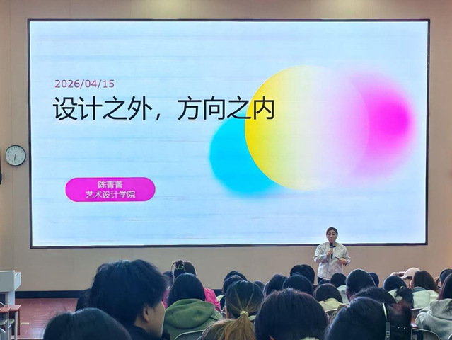 2026年4月15日晚,艺术设计学院“设计之外,方向之内”主题讲座圆满落幕。本次讲座由学院陈菁菁副院长主讲,面向全院学子,围绕设计学习、职业规划与未来发展进行深度分享。