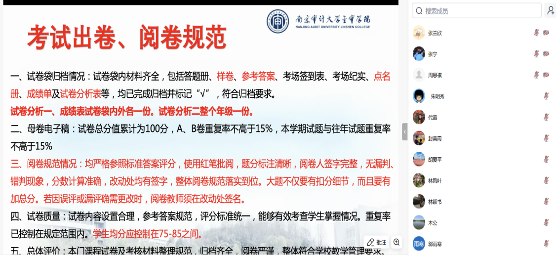 会议伊始,会计系主任刘润宇老师就2026届毕业论文推进情况作专项部署。她强调要严把选题契合度、数据真实性、研究方法匹配度、结构严谨性、学术规范性五道关口,坚决防范AI代写、数据造假、查重超标等问题。在日常教学规范方面,会议着重强调教学纪律与课堂管理,要求教师聚焦到课率、抬头率、前排座率,强化课堂秩序管控,考试环节严格执行出卷标准,以全流程规范守护教学底线。