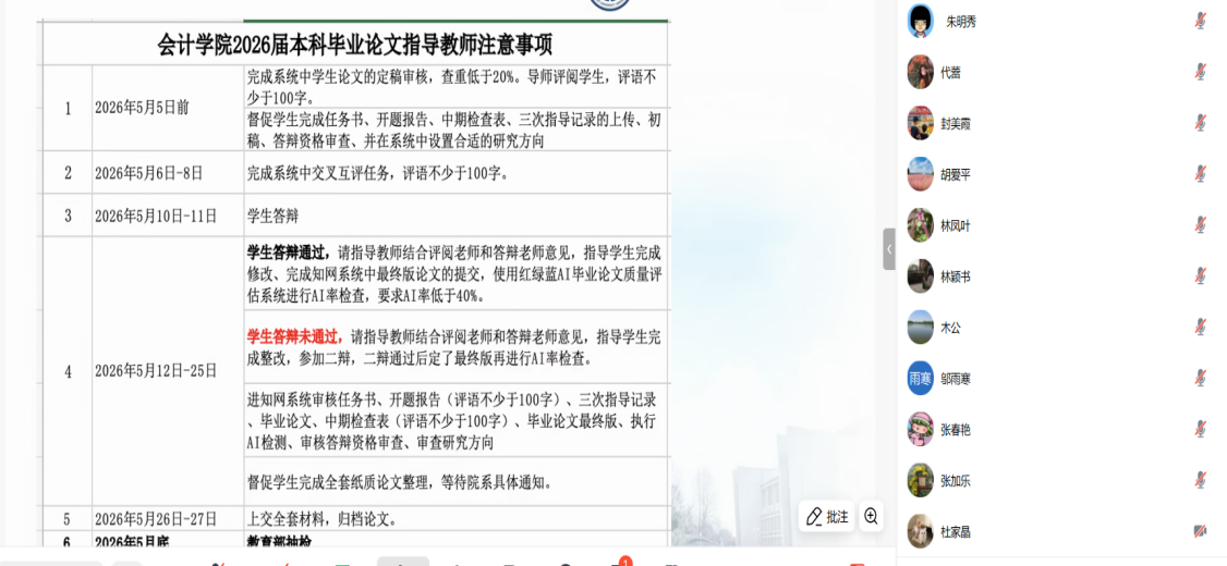 此次会议进一步统一了思想、明确了标准、压实了责任。下一步,会计学系将以此次会议为契机,紧盯时间节点、狠抓过程管理、强化督导检查,全力以赴做好毕业论文收尾与日常教学各项工作,持续提升人才培养质量,为学院高质量转型发展夯实基础。