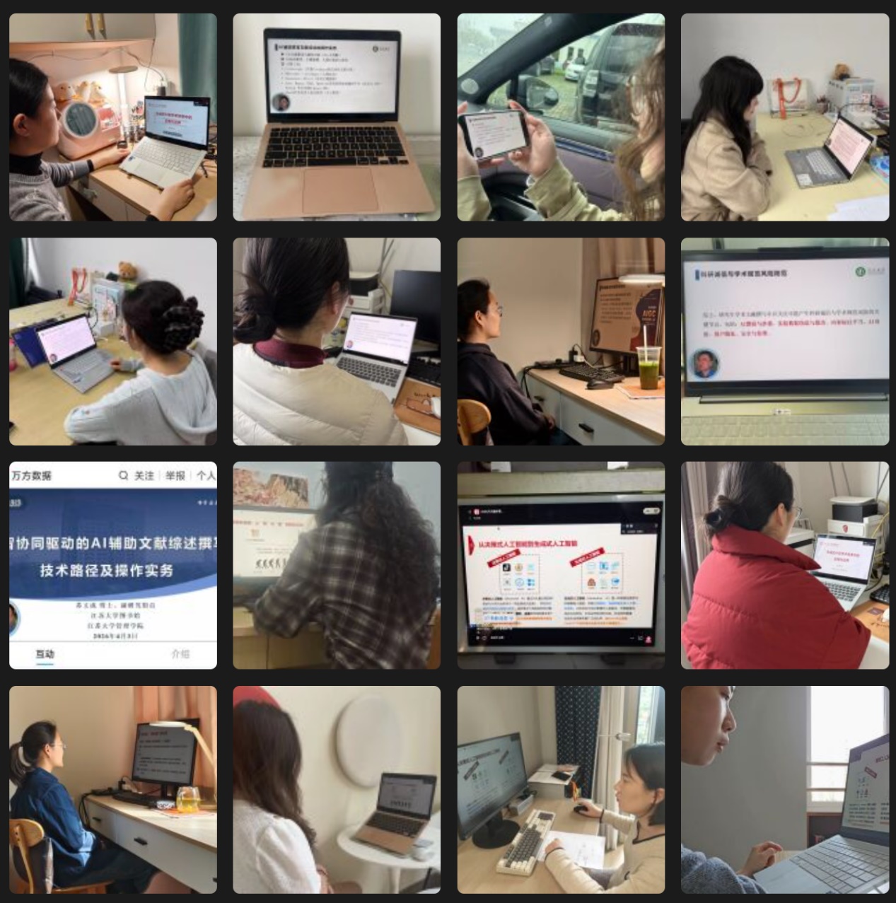 本次训练营紧扣AI时代科研范式变革,内容涵盖生成式AI应用、AI辅助文献综述、AI检索工具使用以及AI学术伦理规范等四大模块。学院教师利用课余时间集中或自主观看直播,在学习中夯实“学”的基础,通过系统培训,深入理解人工智能在科研全链路中的正确应用方法;在反思中激发“思”的活力,结合自身教学与科研实践,围绕AI工具的边界与规范展开研讨,为后续创新性应用构思方向。